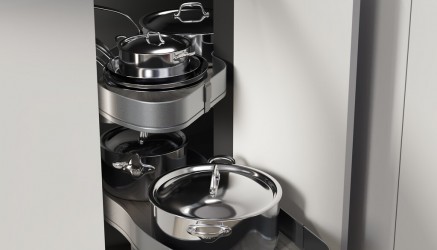 Uittrekbaar hoek-opbergsysteem voor keukenkasten linkse uitvoering